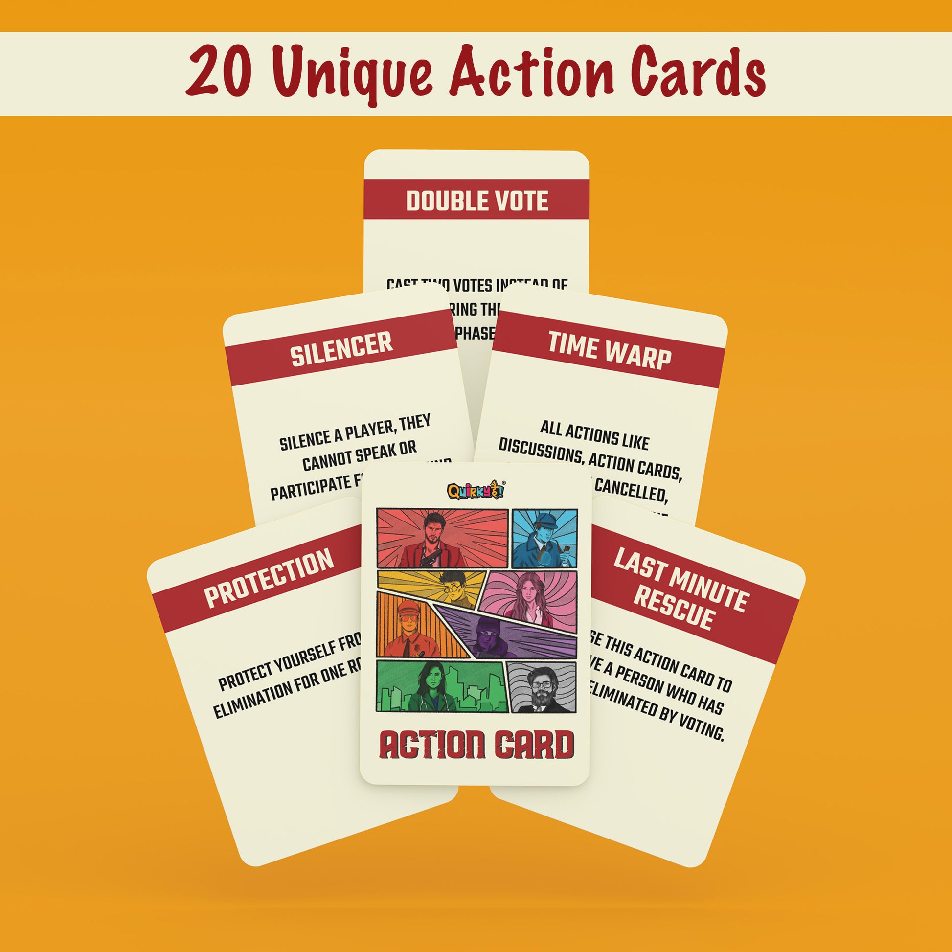 Add excitement with 20 action cards such as Silencer, Protection, and Double Vote, giving each player unique powers and adding twists to the game. Strategize, deceive, and outwit your friends to rule Mafia City!