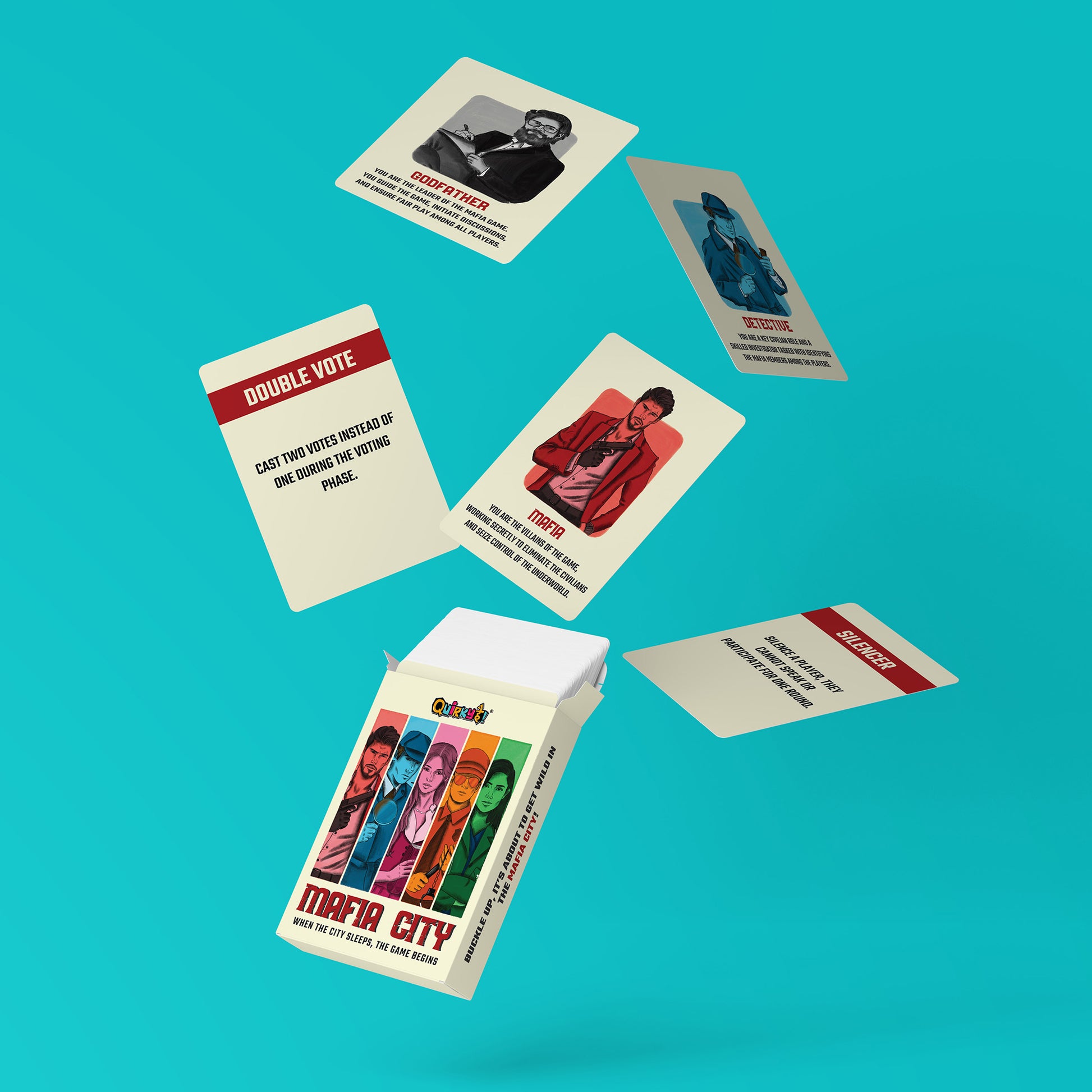 Enter a world of intrigue with Mafia City! Featuring 20 role cards with characters like the Godfather, Mafia, Civilian, Doctor, Detective, Jailer, and Terrorist, plus 5 customizable blank cards.